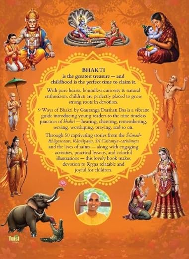BHAKTI is the greatest treasure- and childhood is the perfect time to claim it. With pure hearts, boundless curiosity & natural enthusiasm, children are perfectly placed to grow strong roots in devotion. 9 Ways of Bhakti by Gauranga Darshan Das is a vibrant guide introducing young readers to the nine timeless practices of bhakti-hearing, chanting, remembering, serving, worshiping, praying, and so on. Through 50 captivating stories from the Srimad- Bhagavatam, Rāmāyaya, Sri Caitanya-caritanṛta and the lives of saints-along with engaging activities, practical lessons, and colorful illustrations- this lovely book makes devotion to Krsna relatable and joyful for children.